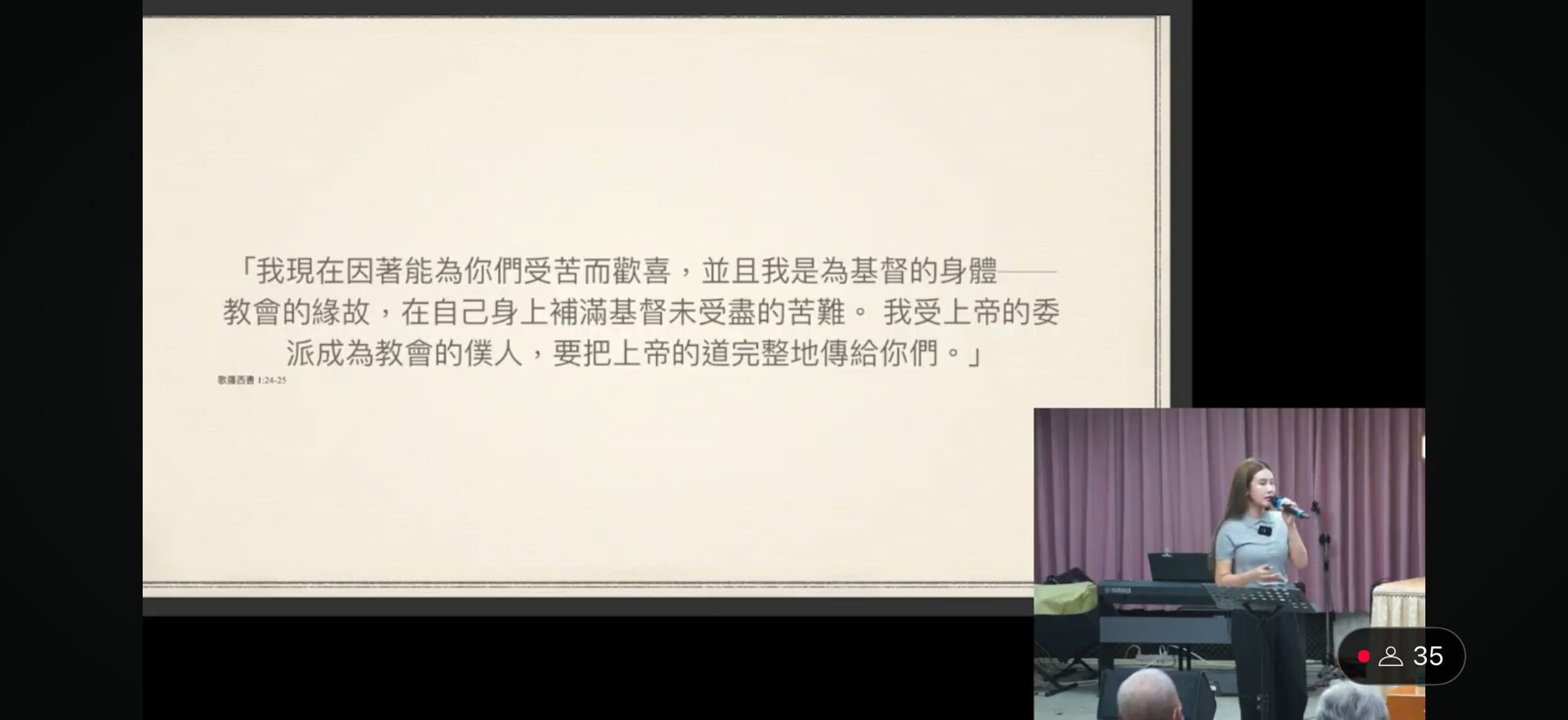 我們都有這個喜樂由。然後最後,我現在這個經文是哥羅西書一章二十四到二十五節。我現在因著能為你們受苦而歡喜,並且我是為基督的身體、教會的緣故在自己身上補滿基督為受盡的苦難。我受上帝的委派,成為教會的僕人。我們要把上帝的道完整的傳給你們。我們要建立教會,真的每一個人都要來走過人生的這道路。