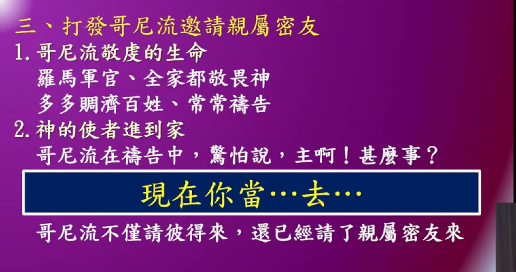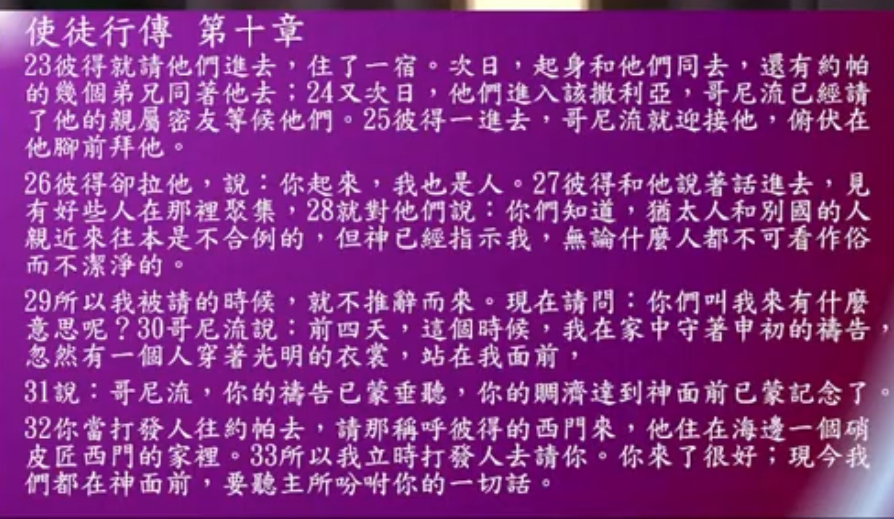 這對哥尼流來說,從來沒有發生過的事情,但他順服了,天使告訴他,他說你現在你應當要怎麼樣,你就趕快去吧,是各位弟兄姐妹,我覺得很奇妙,哥尼流他沒有聽信福音,但是神仍然怎麼樣?愛他,仍然揀選他,聖靈超自然的工作一樣能夠發生在這個所謂外邦人的身上,上帝的全能超乎一切。