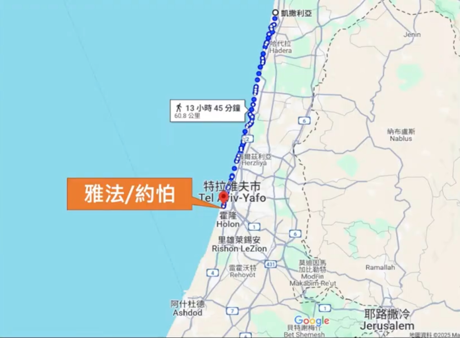 • 那我稍微google了一下,這個是我在google上面地圖google一下,我說到底約帕是在哪裡,原來就是雅法,就是現在的特拉維夫下面有一個古城,就是古時候這個約帕。
