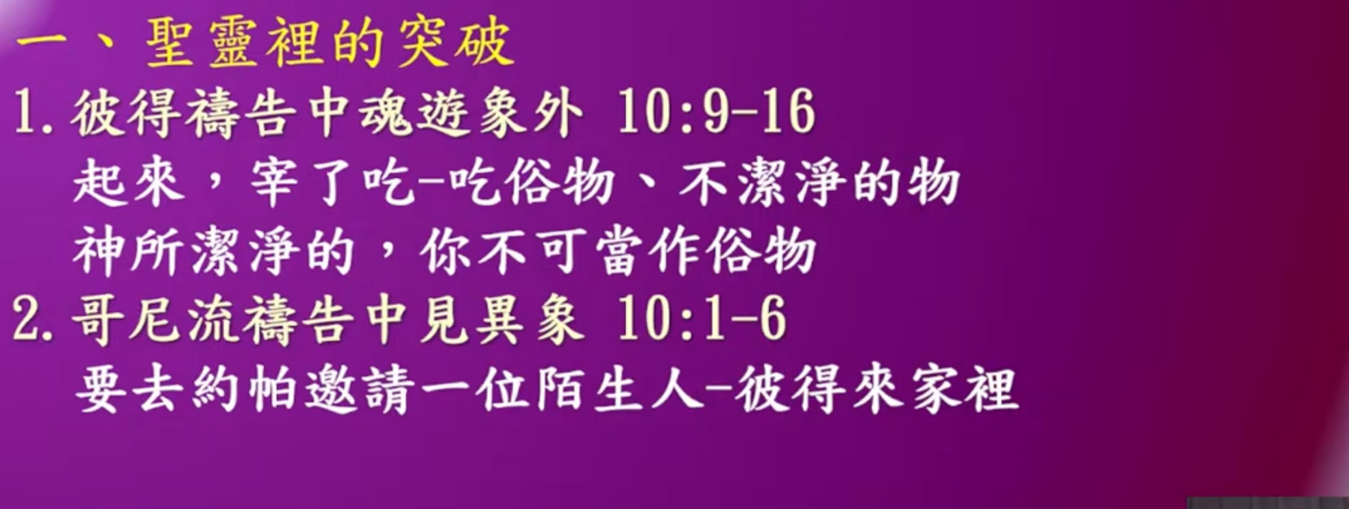 • 好,如果我們稍微往前看,彼得禱告禱告,他有他禱告的習慣,禱告禱告,竟然有個突破,見到異象,聖經說了,