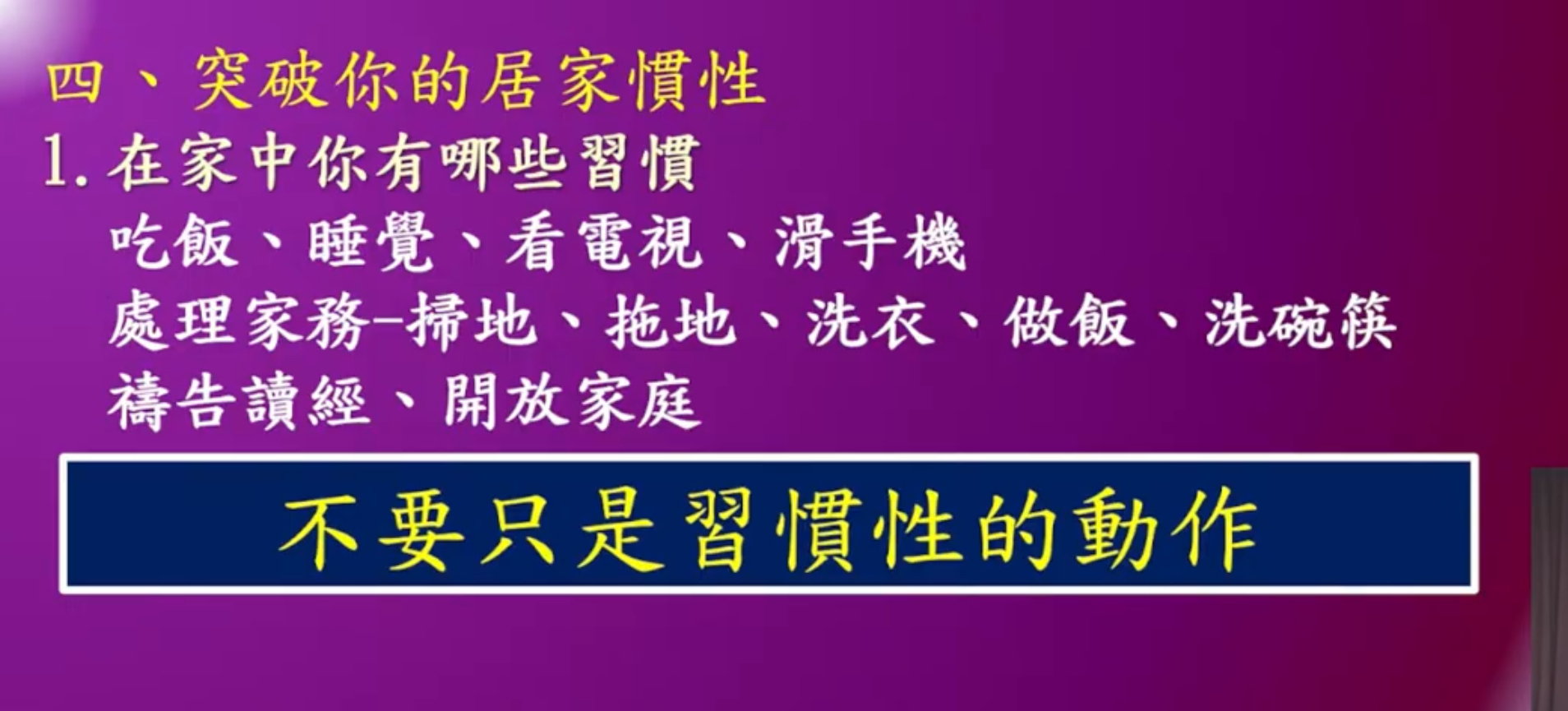 我想她是很認真,她會回喔,弟兄姊妹瞭解我的意思啦許多時候我們會有習慣性的動作但做久了真的沒意思,真的沒意思,我覺得至少在我手上的這些群組當中,在我的居家這種習慣性的動作上那最後我再講一個,我以前在家裡面也不會洗碗的,因為我從小我們家不需要我洗碗。
