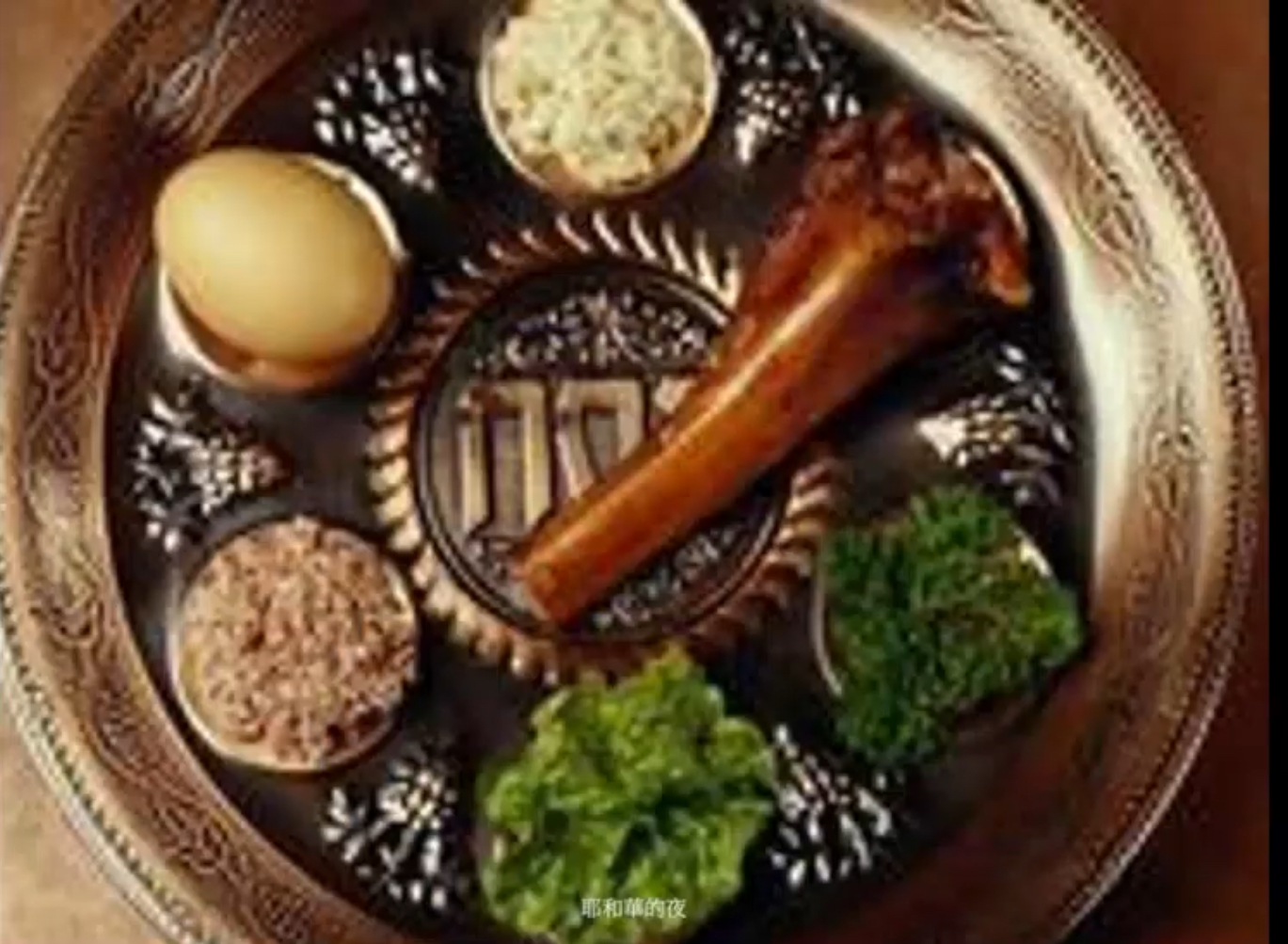 猶太人一定會把很多的食物放在盤子裡面,會把蛋,把羊肉把五餅二魚把苦菜把水果泥這些食物會放在一個凹盤很像我們今天自助餐盤一樣那裡有五個凹槽有沒有有五個凹槽一個放蛋一個放羊肉一個放五餅二魚一個叫做一個放苦菜一個放水果泥大概放在五個凹槽裡面那他們就開始。