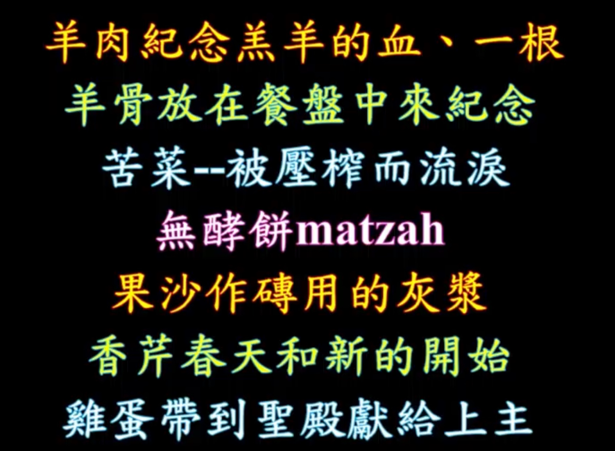 在那裡吃了弟兄姊妹,大概大致上是這樣子大致上是大致上是這樣子那這些食物放在五個凹槽裡面每個食物呢都有一個非常特別的意義,特別第一個羊肉第一個羊肉,那他們也吃五餅二魚五餅二魚。