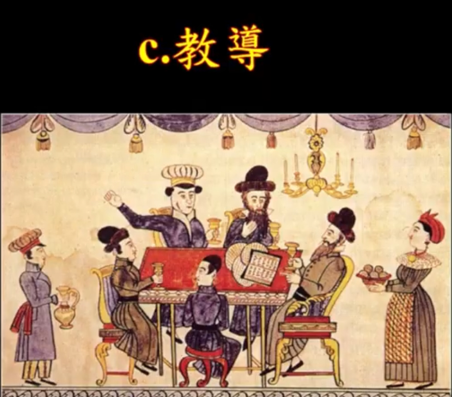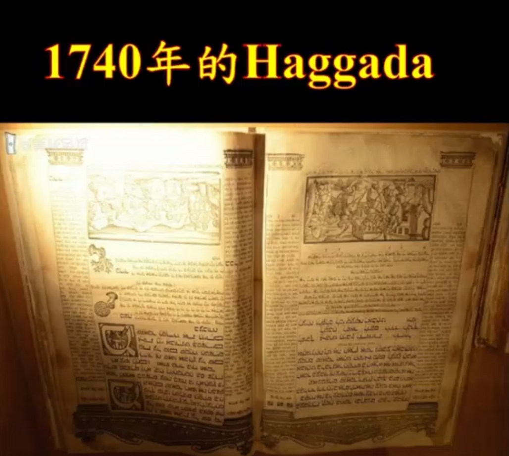 好,那接下來呢,他們要做一件事,要教導啦,你看那個屋頂上提琴手,一開始爸爸宣佈開始的時候,那這個叫,好,那要教導,在逾越前的晚餐,家中最小的孩子要問四個問題,這四個問題,為什麼今天跟平常不一樣,為什麼,那這個四個問題啊,這個四個問題叫,小孩子怎麼記得起來,所以他把它編成一首歌,那至少要問一個問題,今天為什麼跟平常不一樣,那猶太的爸爸,就開始講,從摩西開始講起,從摩西怎麼出生,以色列人在埃及的怎麼悲慘,出埃及,然後過鴻海,這段歷史講給他們的下一代聽啦,所以鄭新理領到五百塊,不算多啦,對不對,吃一頓這個蠍豆都不止五百塊,那這個叫什麼,這個叫Haggadah,叫Haggadah,這是1740年的Haggadah,