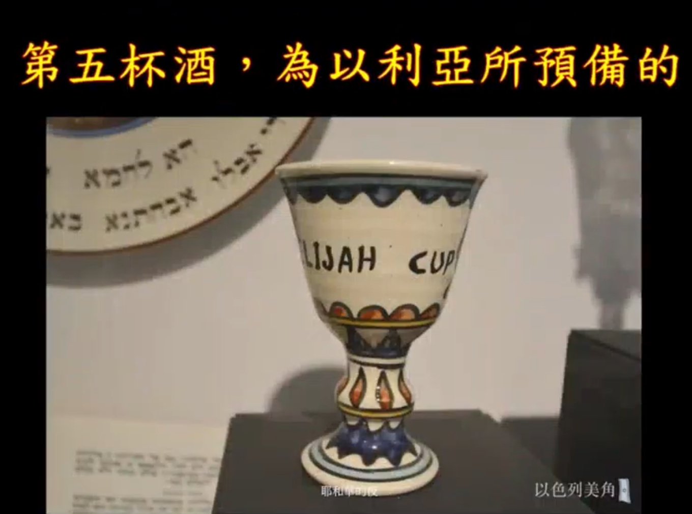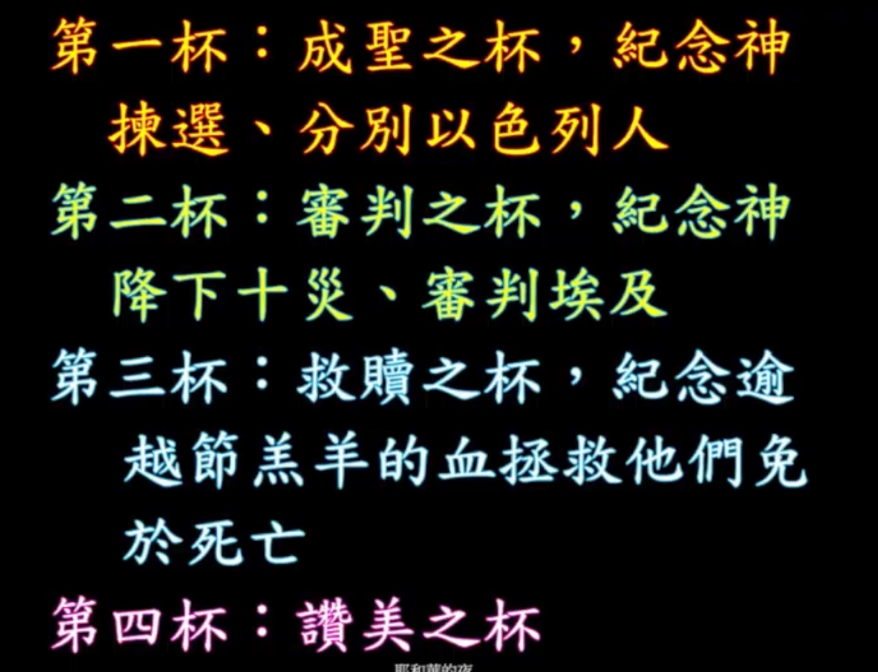 現在沒有人看得懂,因為這古希伯來文,沒有人看得懂,好,那在這個之外,還要有四杯的酒,第一杯叫成聖之杯,因為神揀選了以色列人,分別以色列人,第二杯那叫審判之杯,神降下十個災,審判埃及,那第三個杯叫救贖之杯,因為一夜間的血讓他們免於死亡。