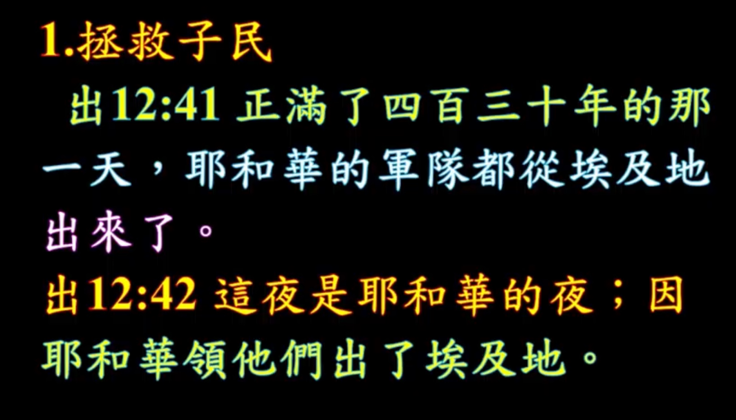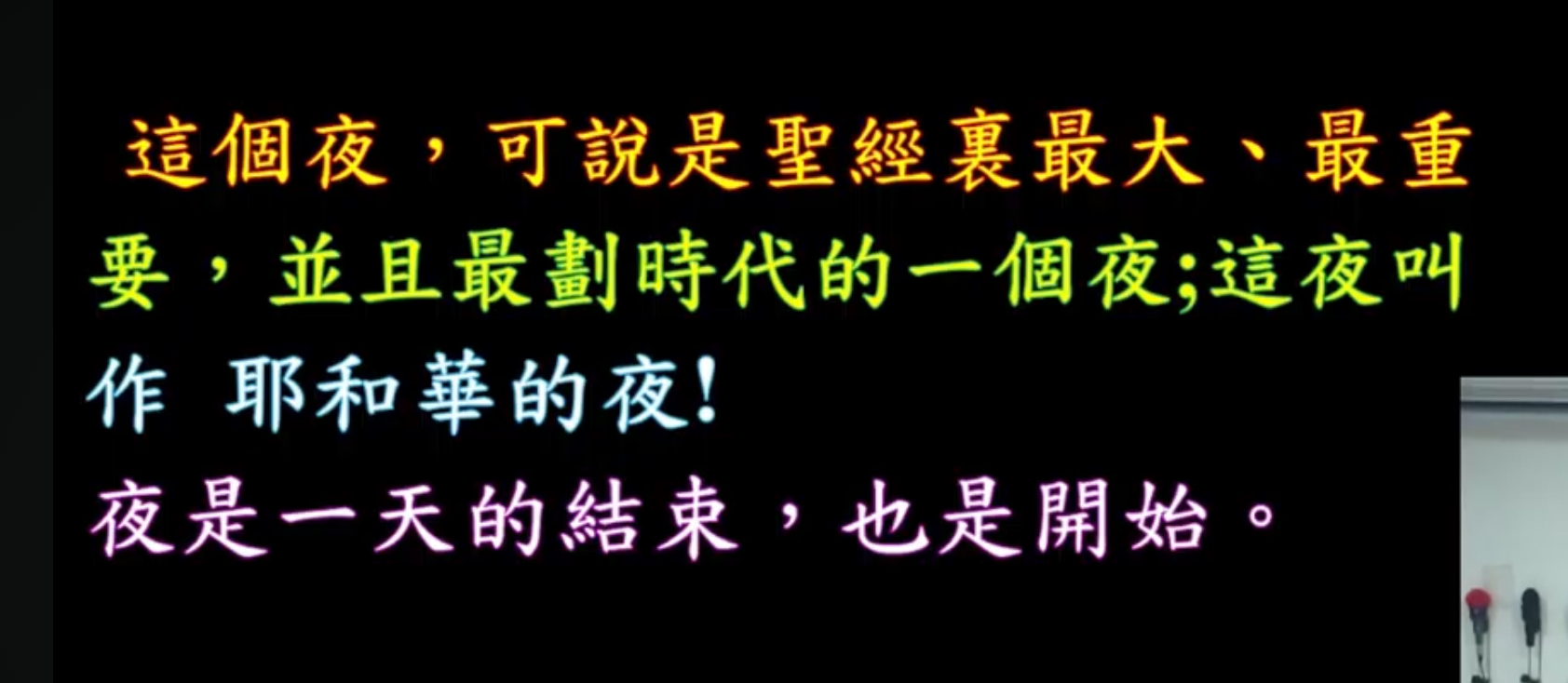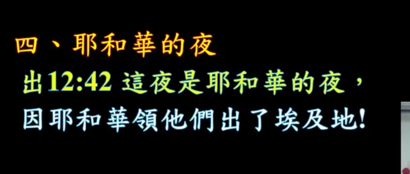 弟兄姊妹,所有的節慶哪裡有在晚上慶祝的?所有節慶都白天慶祝嘛,哪裡晚上慶祝,但是這一個夜是怎麼樣?可以…說聖經裡面最大的、最重要的而且是化時代的一個夜這個叫做耶和華的夜,夜是一天的開始,夜是一天的結束,弟兄姊妹,你經歷過黑暗嗎?如果我問你說基督徒是什麼時候生下來的我不曉得你什麼時候生的,那我這個基督徒是半夜十二點鐘生出來的。