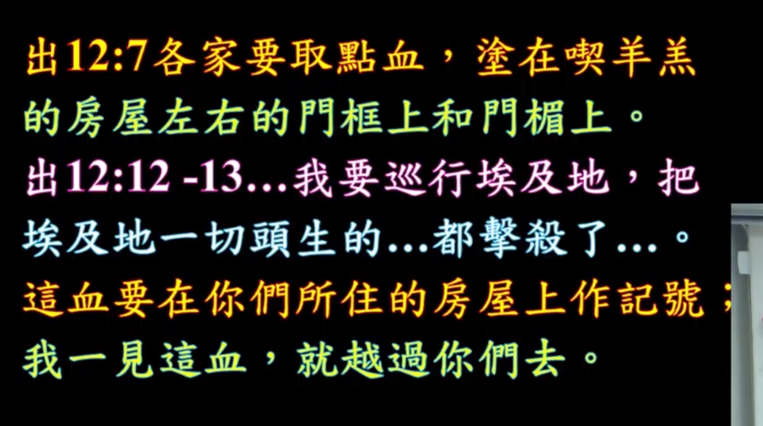 上帝的背,這樣跳過去,原文就是這個意思,現在的政客常常說over my body,有沒有,對不對,你要做什麼,先踩過我的我的身體,那都是騙人的啦,那個學聖經的啦,但是他們沒有信耶穌啦,所以上帝親自來覆蓋在長子的上面覆蓋在你的上面,讓那惡者讓那滅命的天使,踩著上帝的背上跳過去,這個就是雨夜節中文聖經翻譯得非常好,在希伯來文。