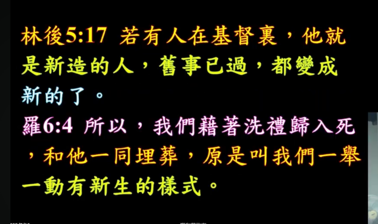 若人在基督裡,他就是新造的人,就是已過,都變成新的了,所以我們藉著洗禮歸入死,和他一同埋葬,原是叫我們一舉一動,有新生的樣式。