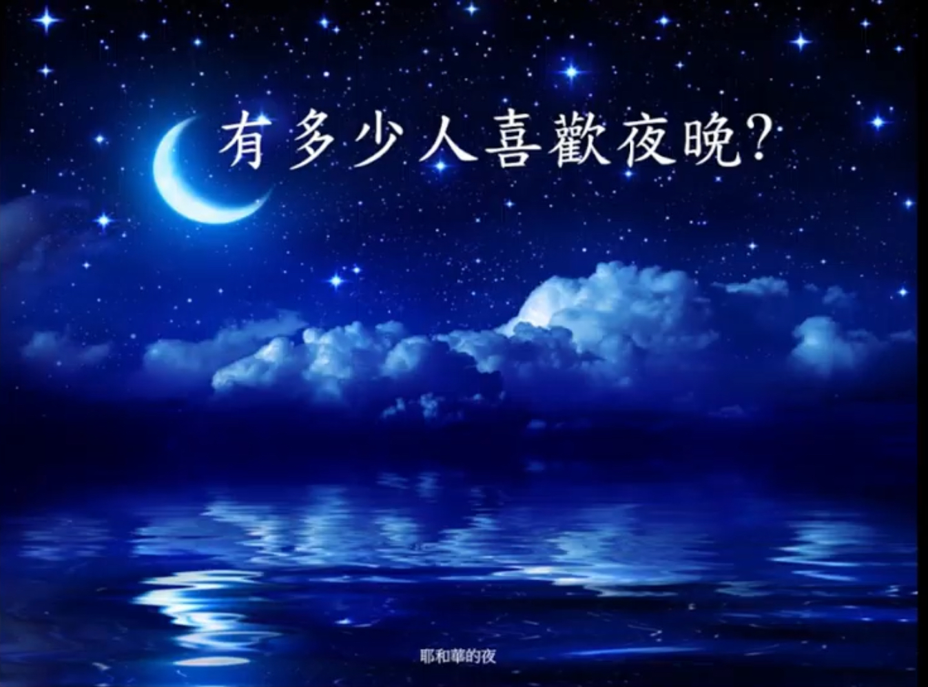 有多少人喜歡夜晚?沒有人喜歡夜晚。我信主之後,也遇到過很多次的黑夜,甚至我懷疑上帝的存在。弟兄姊妹,每次總是夜進田,晨光總在搖尾的地方,向我來招手。弟兄姊妹,我大學畢業之後,不曉得要去哪裡工作。小弟是在第三屆清仙,最近他們也在清天,這個禮拜剛剛結束。