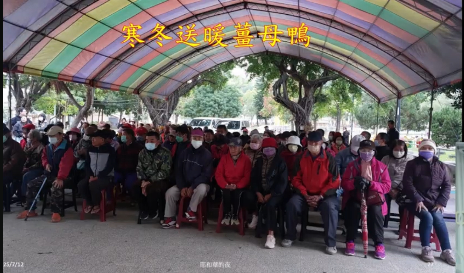 這個是去年寒冬送暖做薑母鴨的。怎麼做?我去店家跟他講說煮薑母鴨請接友他說薑母鴨怎麼煮。開餐廳不曉得煮怎麼煮薑母鴨。我說我來來,你去買來東西買來,我教你怎麼煮,醫生咧,醫生去教他怎麼煮薑母鴨,他煮不出來,說我來幫你煮,弄不出來,說我來幫你裝。我就開始,整頓接友。開始整頓接友。