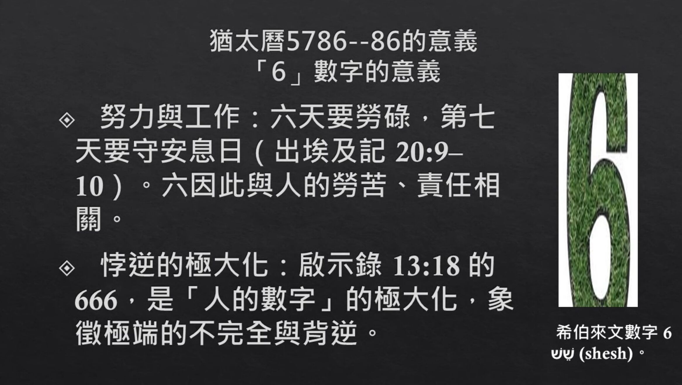 6(人的數字)不完全,易勞苦與悖逆;神以7補足,在安息中完全;本年主題詞:連結、連結、再連結(與神、與人、與使命)。